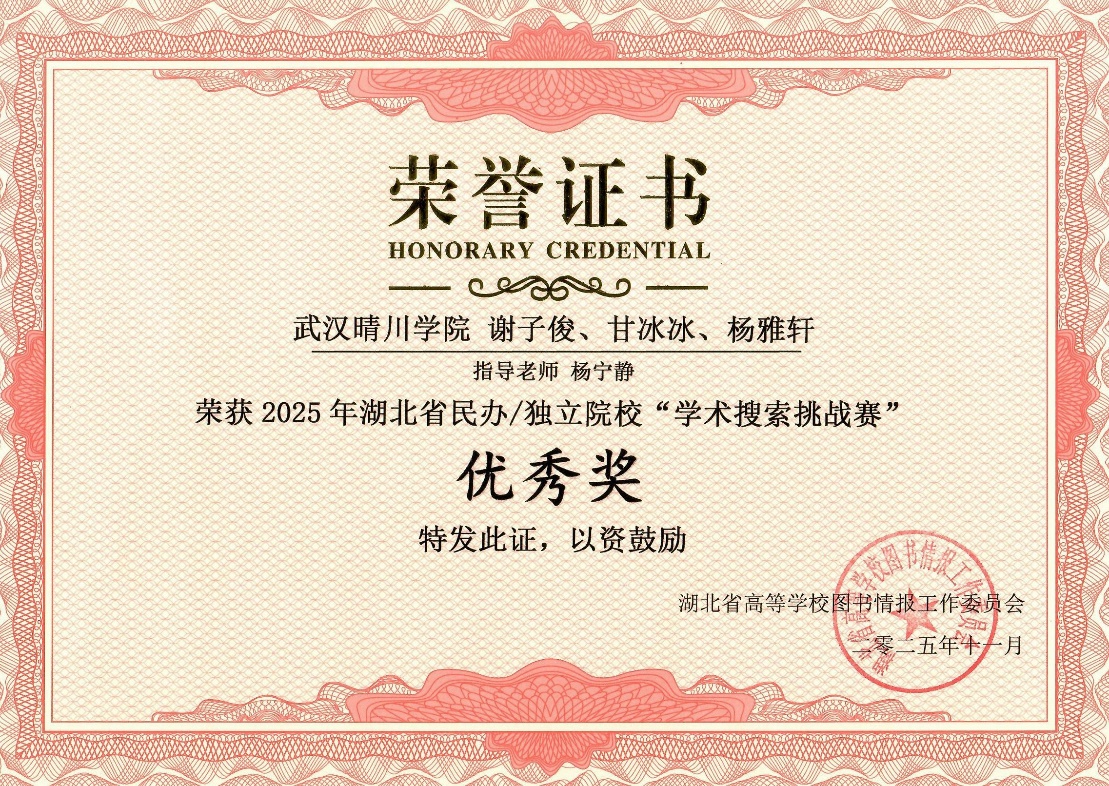 武汉晴川学院图书馆多年来持续开展信息检索培训、学术资源推广与科研能力提升活动,积极营造勤学善思的校园学术氛围。此次参赛并获奖,进一步激发了广大学生对学术搜索与科研实践的热情。期待未来有更多晴川学子在各类学术竞赛中崭露头角,为校争光!