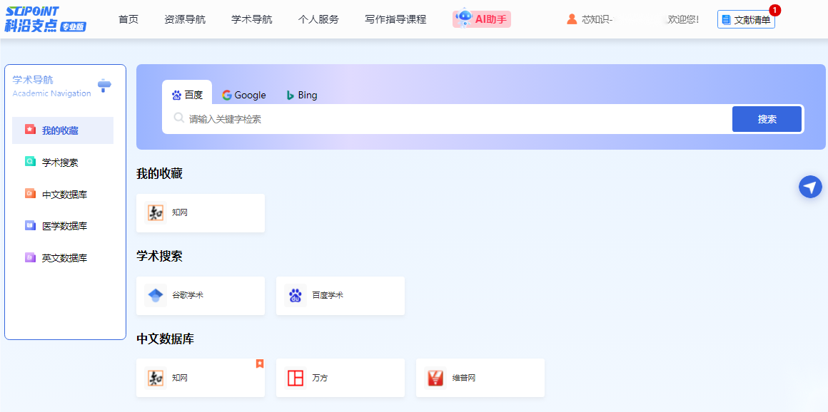 学术导航页为科研工作者提供了全面的学术资源网站导航服务,涵盖学术搜索引擎、中文数据库、医学数据库、英文数据库等。用户通过个人账号登录后,可对常用学术资源网站进行个性化收藏与管理,使用更便捷。